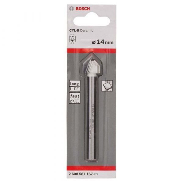 A broca para cerâmica CYL-9 Ceramic é a solução Bosch para perfurar pisos de dureza baixa e média. Possui aresta de corte em metal duro, afiada com diamante, e ponta em forma cônica para centralização exata. Seu design sem espiral que é especialmente projetado para perfurar pisos. Este produto deve ser utilizado sem a função impacto obrigatoriamente. Compatível com furadeiras sem impacto, com ou sem fios, que possuam sistema de haste cilíndrica.