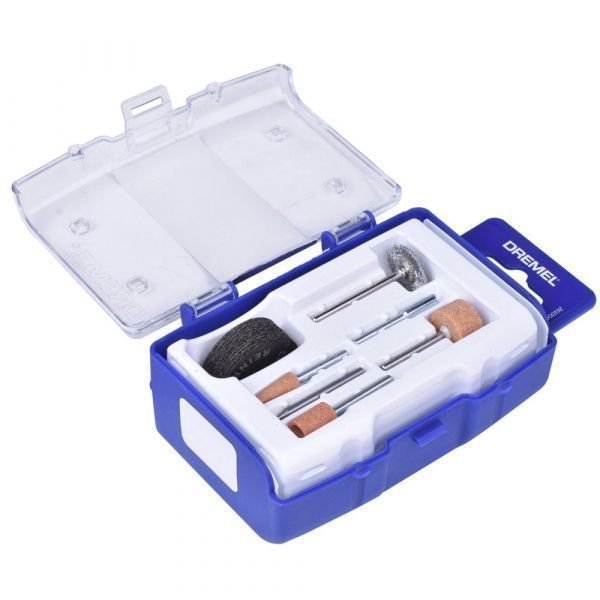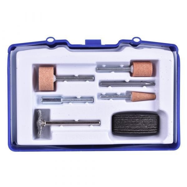 O kit é composto por: cortador para gravação, pedras de esmerilhar de óxido de alumínio, escova de aço-carbono, discos de corte reforçados e mandril.