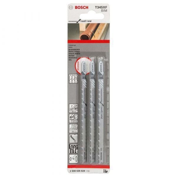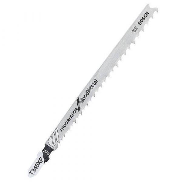 Peças e Acessórios de reposição para produtos BOSCH. 100% Peças Originais.A lâmina de serra tico tico T345XF Progressor for Wood and Metal faz cortes retos rápidos em madeira fina e grossa com metal. A sua geometria de dentes com um passo progressivo permite trabalhar em materiais com uma ampla gama de densidades.