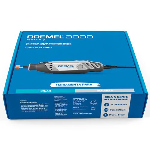 A Micro Retífica Dremel 3000 (MK734+DC420) 220V é a ferramenta rotativa multifuncional ideal para uma ampla gama de projetos. Com acessórios e adaptadores inclusos, permite realizar trabalhos de corte, lixamento, polimento, gravação, esmerilhamento e muito mais em diversos materiais, como madeira, metal, plástico, vidro, couro e cerâmica.